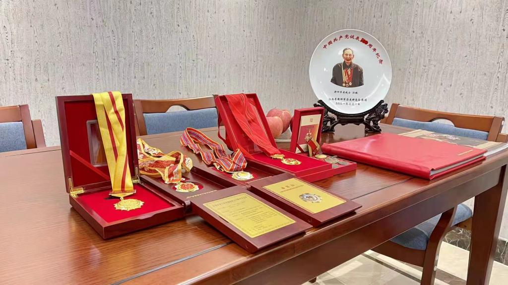 在访谈室里,“铭记英雄卓越功勋,弘扬时代千古风采”“德邦传承红色基因,钢铁筑牢英雄之魂”……桌面上摆放的各种功勋奖章,记录着江琳老人辉煌的革命历程。老人虽然年事已高,但讲起艰苦卓绝的战争岁月仍神采奕奕,一字一句铿锵有力。回顾参军时的艰辛,江琳老英雄仍然记忆犹新。“我十四岁参军入伍,但是我的个子在当时比较矮小,部队并没有要我。”讲到这儿,老英雄竟笑了起来。想起战争年代的艰苦岁月,又潸然泪下。“那个时候条件艰苦,吃不饱穿不暖,可是大家在一起有共同的理想信念,战友们团结一心。我们心里有一个念头,那就是一定要取得胜利!”“我并没有做过多大的贡献,也没有什么特殊的经历,也没有什么轰轰烈烈的战绩,我就是一个兵,我所做的都是作为一名普通战士应该做的。”这是江琳老英雄在接受采访时反复强调的一番话。这些谦虚的话语充分体现了共产党人为国为民,不忘初心的本质,英雄们在平凡琐碎中坚守,在生死抉择前忘我,只是因为让人民幸福,让祖国富强是他们最质朴的心愿,所以才觉得自己的付出十分微小,这些话语让采访的师生们深受感动。