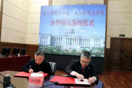通过签署合作协议,双方在九江中院少年家事审判中心共建少年家事审判司法实践基地,在法学院共建少年家事审判司法研究基地。双方将依托两个基地,加强双向互动交流,促进司法实践优势和学术资源优势互补,以预防未成年人犯罪、保护未成年人合法权益、修复婚姻家庭关系、维护婚姻家庭稳定、促进社会安定和谐为宗旨,推动少年家事审判实务水平和理论水平的发展。