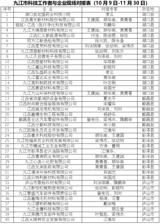 据介绍,本次市“双百行动”对接范围较广,主要聚焦庐山市、彭泽县、湖口县和都昌县四县市,时间从10月9日-11月30日,44位博士和专家深入了四县区40家企业进行了对接合作和技术服务。“九江学院的博士和专家是行动的绝对主力!”市科协副主席陈冬青表示,科协将把市“双百行动”当做每年的重点工作持续推进、抓好抓实,不断创造条件,支持高校科技工作者与企业建立全面的产学研合作关系。