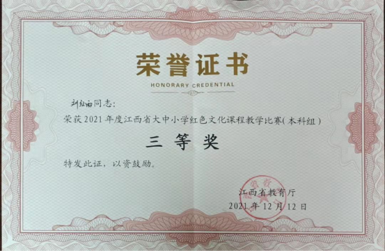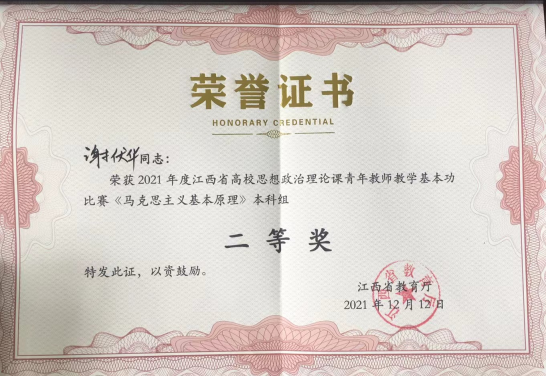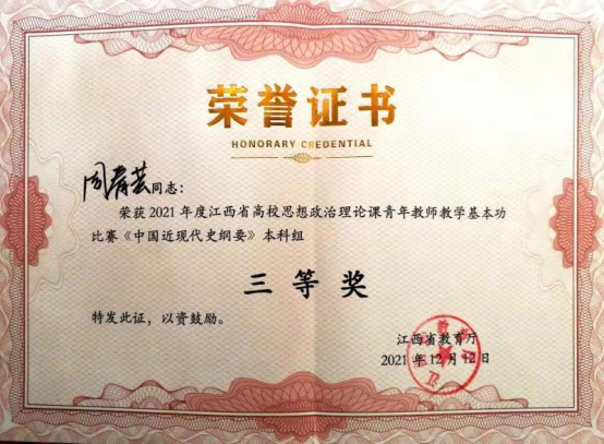 12月10日-12日,由省委教育工委、省教育厅主办的2021年度江西省高校思想政治理论课青年教师教学基本功和大中小学红色文化课程教学比赛分别在江西财经大学和南昌师范学院举行,来自全省83所高校的近400名教师参加了比赛。我校马克思主义学院参赛教师沉着应赛、发挥出色,取得较好成绩,分获二等奖1项,三等奖3项。
