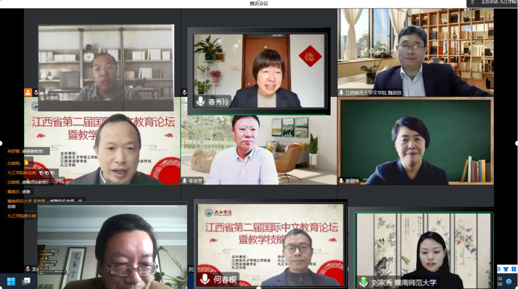 11月26日,由江西省孔子学院工作联盟、江西省语言学会和我校共同主办,我校文学院、国际合作交流处共同承办的江西省第二届国际中文教育论坛暨教学技能大赛成功举办。来自北京语言大学、上海师范大学、辽宁师范大学、苏州大学等高校的特邀专家和江西省11所高校的师生近200人云上聚会参加论坛,共同探讨国际中文教育事业发展。来自江西省11所高校的46名在校学生参加了11月15日至26日举行的教学技能大赛。论坛和大赛主要采用线上形式举行。我校党委委员、副校长王万山参加论坛活动,并致欢迎辞。学校教务处、国际合作与交流处、发展规划与学科建设处、文学院等单位负责人在文学院参加论坛活动。
