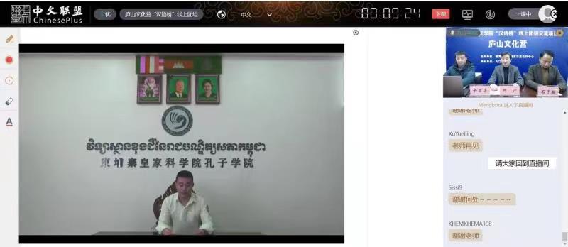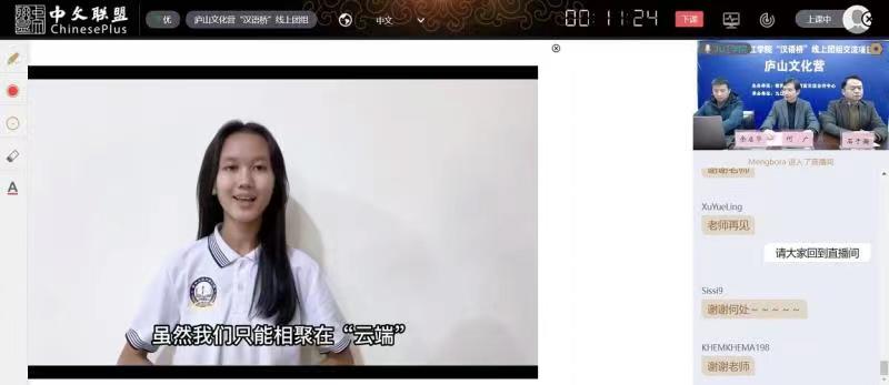 12月16日下午,由教育部中外语言交流合作中心主办,九江学院承办的九江学院2022年“汉语桥”线上交流项目——庐山文化营闭营仪式顺利举行。学校国际合作交流处负责人、柬埔寨皇家科学院孔子学院中方院长以及来自柬埔寨、缅甸和泰国的100多位营员相聚云端,共同见证了此次活动的完美收官。