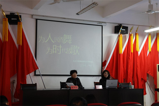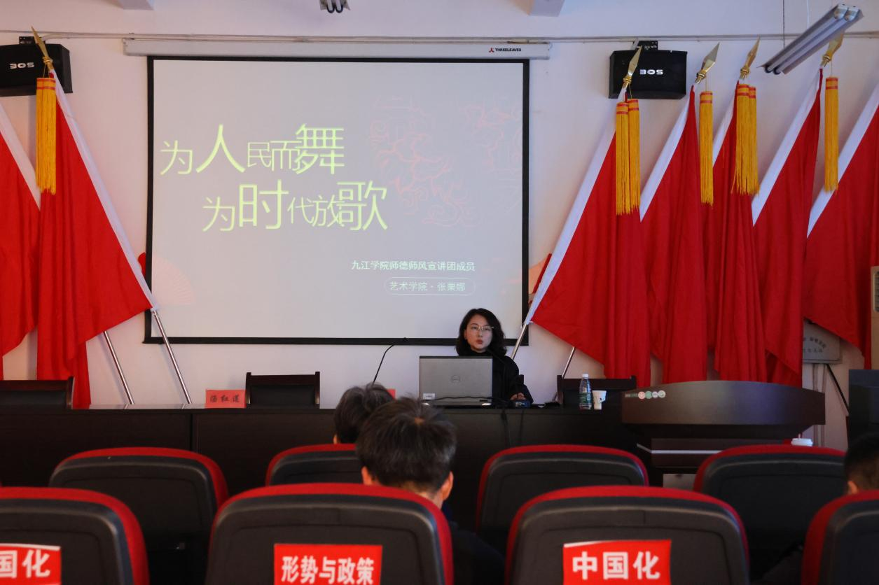 在首场宣讲会中,九江学院教书育人楷模、师德师风宣讲团成员张栗娜以《为人民而舞、为时代放歌》为题向马克思主义学院全体教师作了师德师风宣讲。从教十八年来,张栗娜始终坚守在教学一线,对教育事业有着执着的追求和强烈的使命感,乐当学生的“引路人”;在专业创作上精益求精,勇攀高峰,为大力传播江西地域文化起到了积极作用。
