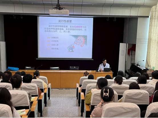 陶凯又为学生们科普了甲流的相关知识,甲流是一种由流感病毒引起的高传播性疾病,易于在密闭场所中传播。在甲流高发期,学生们应该通过多种方式进行预防,如保持室内空气流通、勤洗手等。