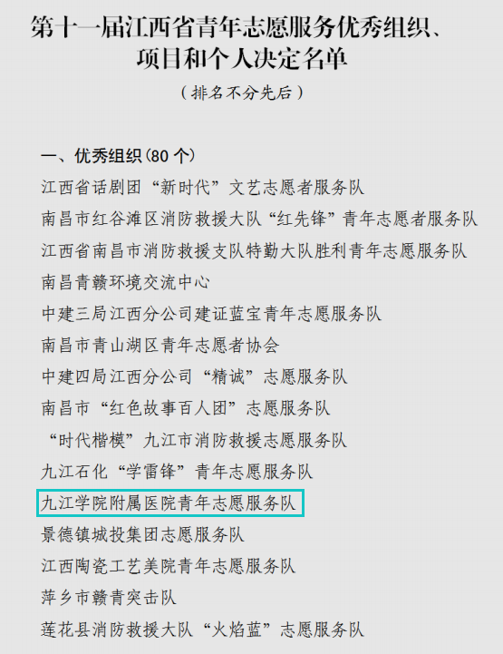 九江学院附属医院青年志愿服务队荣获“江西省青年志愿服务优秀组织”称号