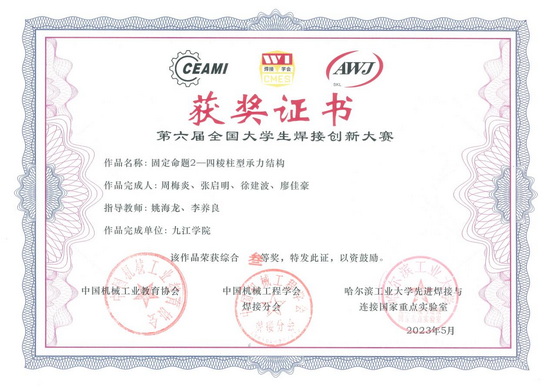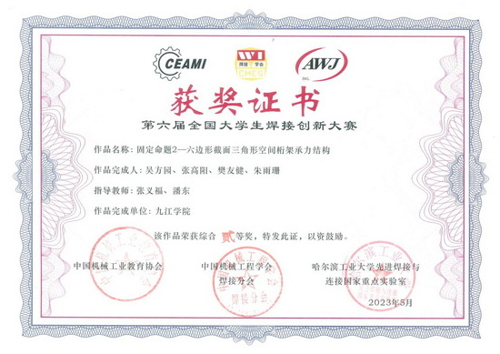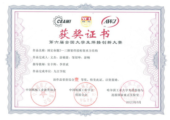 我校材料科学与工程学院积极组织焊接技术与工程专业学子紧密结合赛事题目要求,从材料选择、焊接工艺设计、结构设计、装备智能化、方案经济性等方面进行设计,设计作品面向工程应用。经校内遴选,共有4项作品参加全国决赛。其中,2021级本科生文杰、涂敏捷、邹绍坤、游畅的作品《三脚架焊接桁架承力结构》荣获全国一等奖;2021级本科生黄书飞、叶德州、刘涛鑫、邓康宁的作品《三角台焊接空间桁架承力结构》和吴方园、张高阳、樊友健、朱雨珊(2022级)的作品《六边形截面三角形空间桁架承力结构》荣获全国二等奖; 2021级本科生周梅炎、张启明、徐建波、廖佳豪的作品《圆柱型承力结构》荣获全国三等奖。
