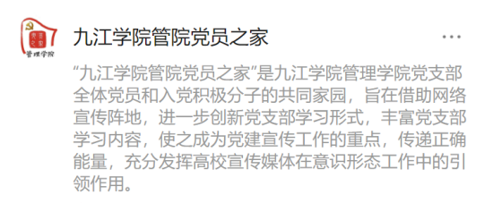 “九江学院管院党员之家”公众号着力为广大学生党员打造随时、随地、随身学习的移动平台。2016年9月8日成立至今,微信公众号关注量达4千余人,发表原创推文达255余篇,推文平均阅读量350余次。公众号持续关注学生党员组织生活,聚焦时事热点。2020年、2021年连续两年获“九江学院优秀校园新媒体运营团队奖”,2021年再获“九江学院最喜爱新媒体奖”。