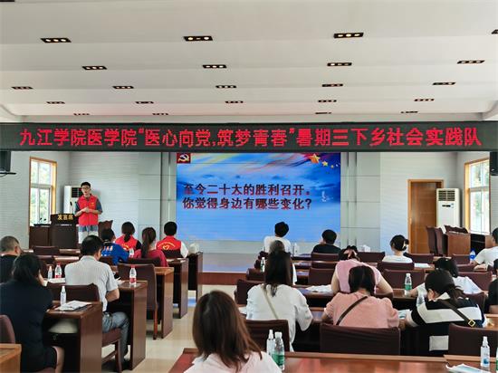 九江学院医学院“医心向党,筑梦青春”暑期三下乡社会实践队走出校园,走向乡村,深入基层,切实把课堂学习与乡村实践紧密结合起来,充分发挥医学生的专业特长,厚植爱党爱国情怀,弘扬红医精神,展现出九医学子为乡村振兴,为全面建设社会主义现代化国家贡献青春力量的决心和信心。