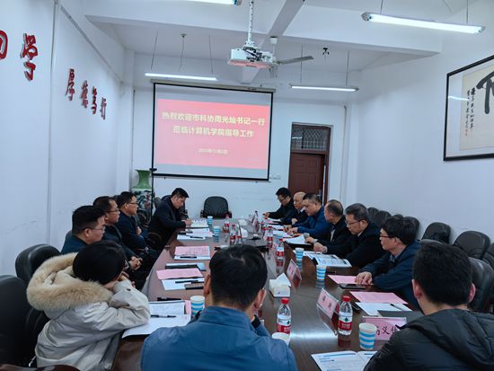12月2日下午,九江市科协党组书记周光灿一行深入我校计算机与大数据科学学院进行调研并召开座谈会。副校长严平出席会议并讲话。市科协副主席陈冬青、学会部负责人和市电子学会秘书长、江西才气软件技术有限公司负责人刘才福等陪同调研。我校计算机与大数据科学学院负责人、博士教师代表,大学科技园企业代表等参加座谈。
