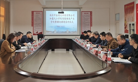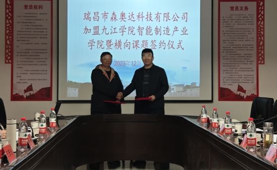 政校企三方领导共同见证了瑞昌市森奥达科技有限公司与我校智能制造产业学院签订共建和横向课题合作协议。