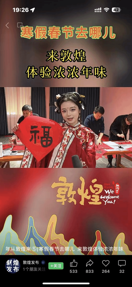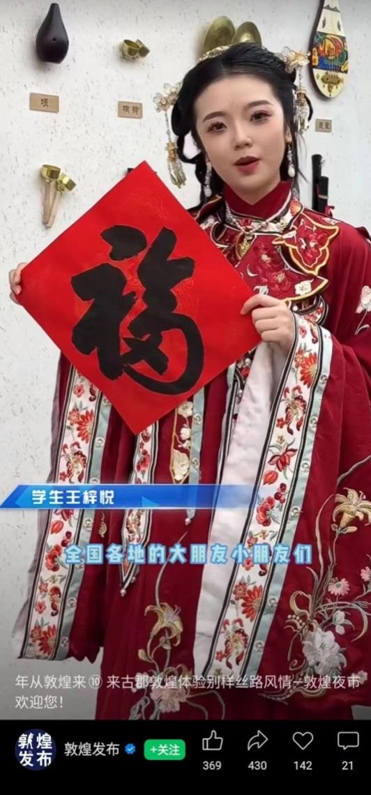 当代大学生是“返家乡”文旅事业的有生力量。1月18日下午,药学与生命科学学院A2141班王梓悦在参与学院组织的假期“返家乡”社会和实践“红色走读”活动中,主动对接敦煌市文旅局和共青团,参与由敦煌市文旅局举办的活动,联合敦煌市书法家协会一同为家乡宣传敦煌文化,拍摄多组宣传视频在当地新媒体官方平台进行宣传,收获大量点赞及评论。王梓悦还为市民游客们写春联,送祝福,为敦煌的旅游发展贡献力量,为即将到来的春节添加喜庆祥和。她表示,在假期能参加这样一个活动感到非常自豪,既能为家乡发展贡献自己的力量,也展示了当代大学生的风采。