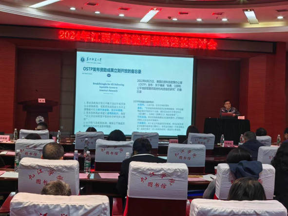 华中师范大学信息管理学院曾建勋教授和上海外国语大学图书馆馆长蔡迎春教授作了两场学术报告。曾建勋教授以《数智时代的图书馆发展》为题,从开放科学入手,围绕人工智能的发展历程、AI知识服务以及ChatGPT对图书馆的机遇等方面进行了剖析,重点阐述了数智时代图书馆功能的拓展以及高校图书馆在数字素质能力教育和资源建设方面的新思考和新举措。曾建勋的报告引发了与会者对图书馆服务模式创新的深刻思考。