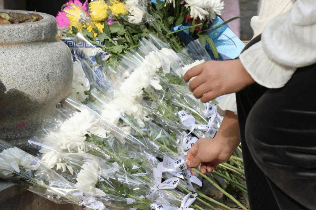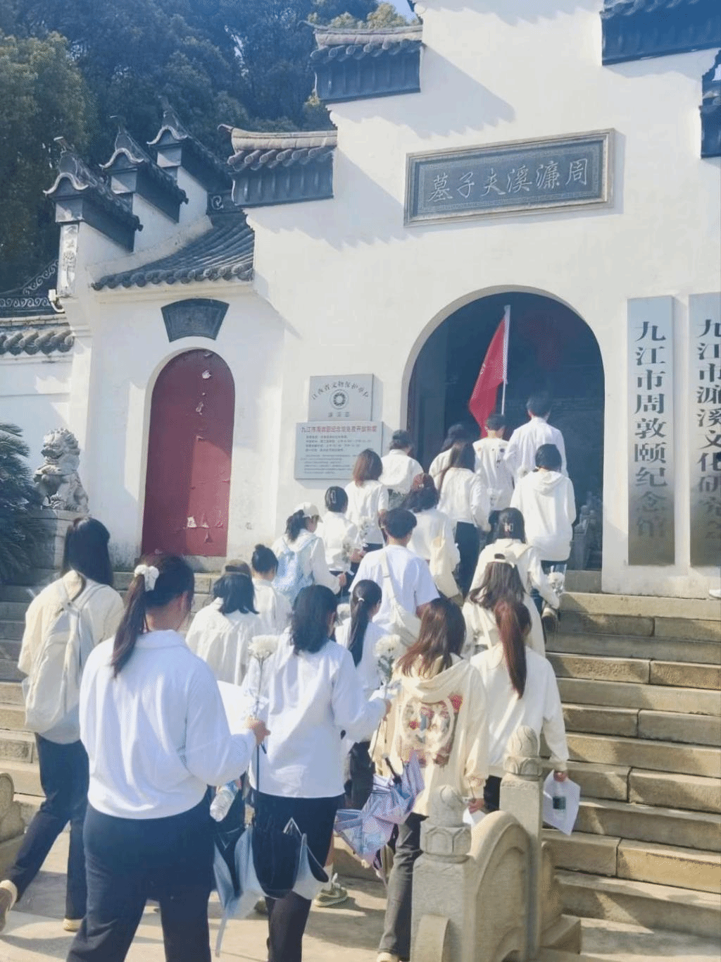 深情朗诵后,同学们走进墓园,穿过清幽的莲池,迈上陡峭的台阶,手捧洁白的菊花,敬献在周敦颐先生墓碑前。全体人员低头伫立,表达缅怀与追思之情。