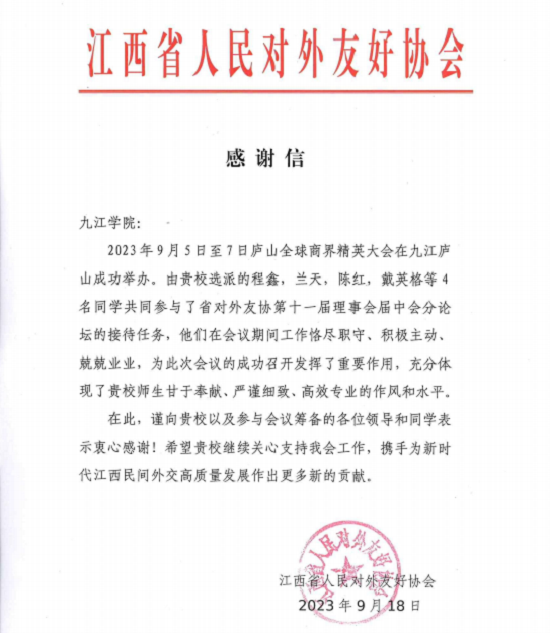 学生为庐山全球商界精英大会提供翻译服务受上级单位表扬