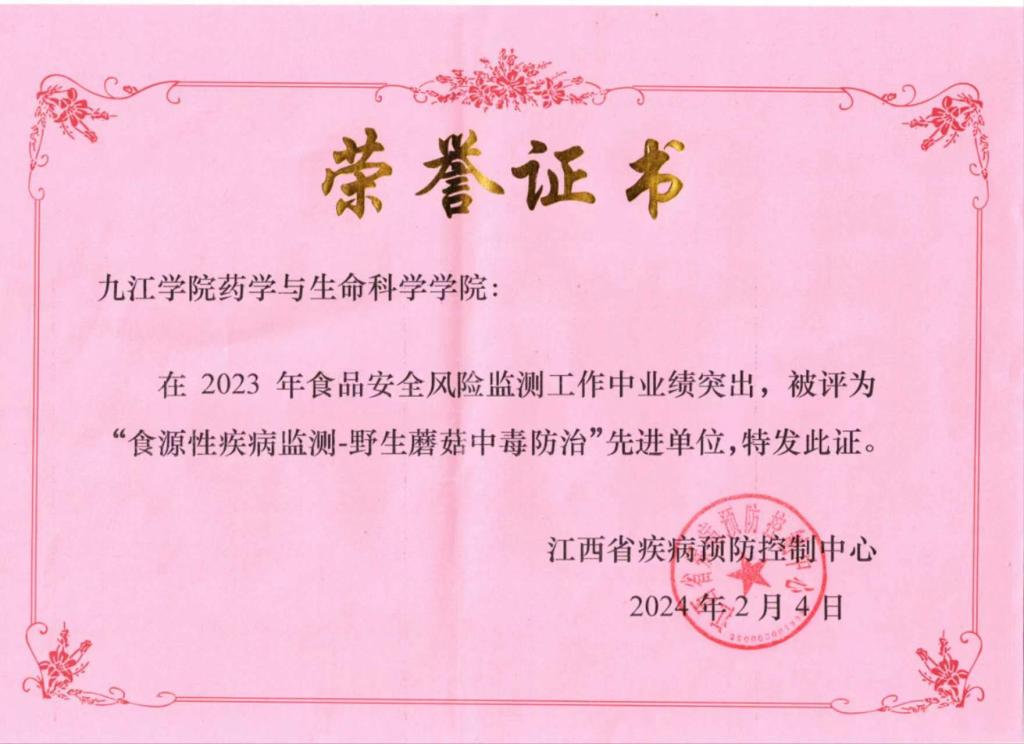 近日,药学与生命科学学院被江西省疾病预防控制中心评为“食源性疾病监测-野生蘑菇中毒防治”先进单位。