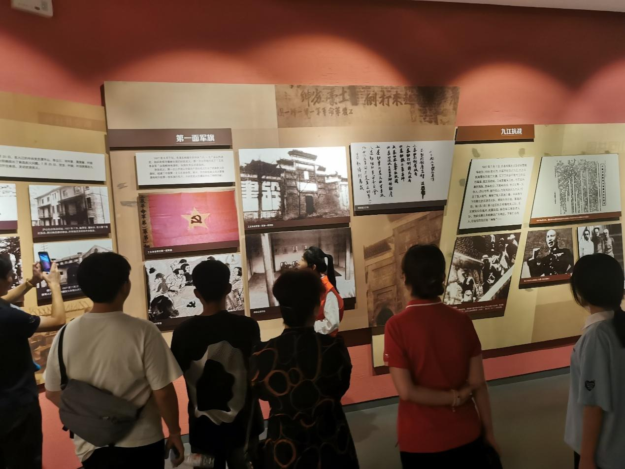 初入馆中,巨大石雕立于门前,古朴庄重。此乃庐山之缩影,峰峦叠嶂,云雾缭绕,将庐山之秀美尽收其中。在讲解员的讲解下参观了九江历史文化展厅、非物质文化遗产展厅,了解到九江的历史发展以及湖口草龙、修水的宁红茶、瑞昌的剪纸、武宁打鼓歌等,特别是九江近现代历史的感人故事和名人事迹。大家边走边看边交谈,“五老”们也很有感触,通过自己成长经历,语重心长告诉00后的同学们——现在的美好生活真的来之不易,现在的和谐盛世来之不易。我们的党多么艰难才得以成长,通过多少革命烈士的牺牲才得以壮大,又通过多少人前赴后继不懈努力才发展到今天。