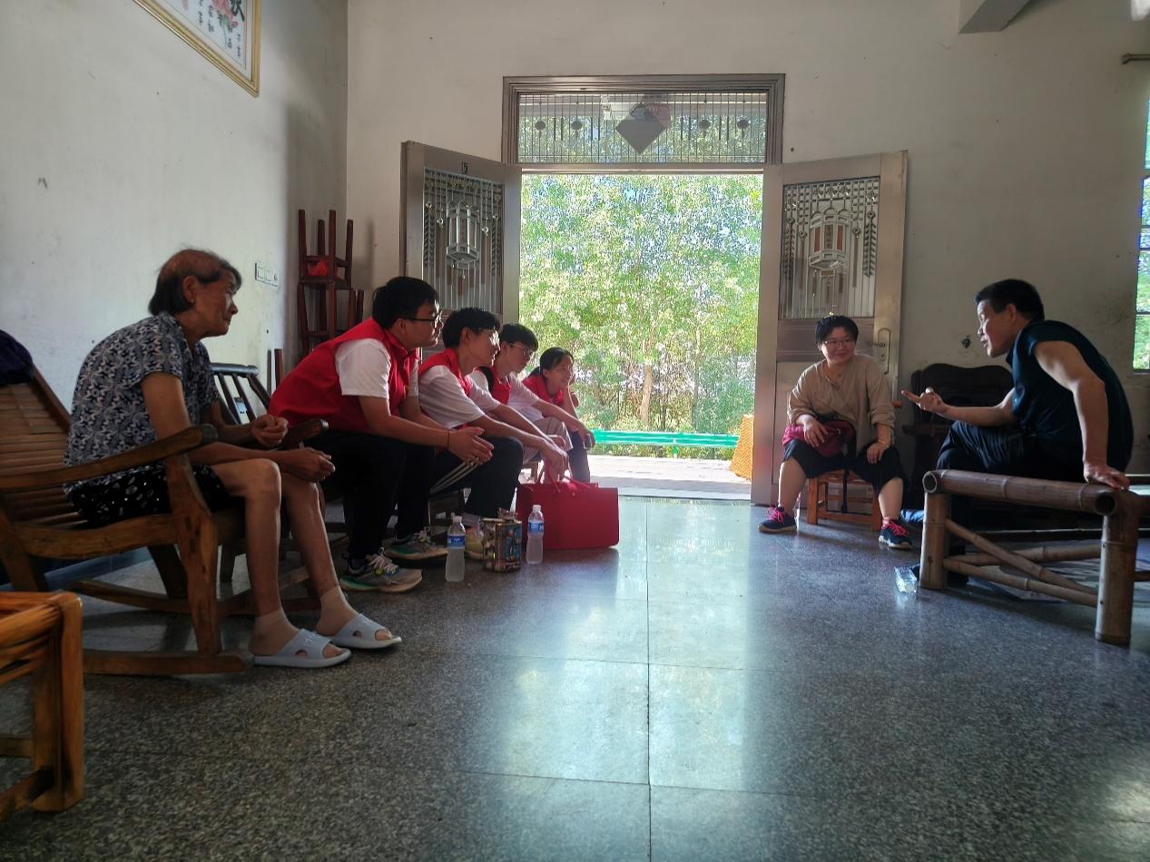 在村头,服务队探访了一位残障老人。这位老人无儿无女,独自照顾着80多岁的老母亲,生活颇为艰辛。服务队队员详细询问了他的身体状况和生活情况,并叮嘱他在炎热的天气里要注意防暑。得知老人平时还需在附近工厂打工赚钱以维持生计,服务队队员深感同情,主动提出帮忙清扫院中落叶,为老人分担一些生活压力。离开时,他们还为老人送上了生活用品和真挚的祝福。