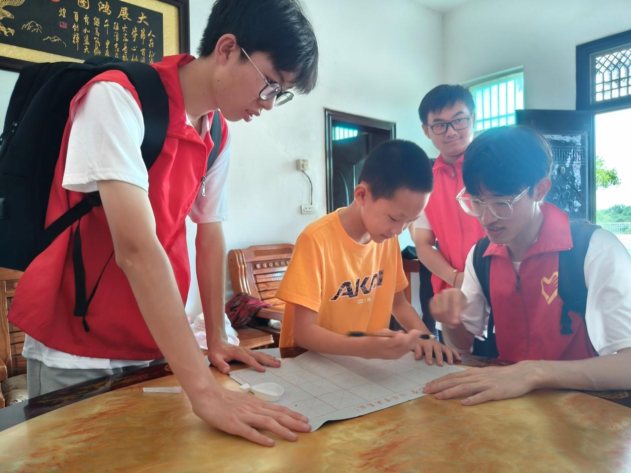 随后,服务队又走访了与孙子相依为命的蔡爷爷家。蔡爷爷介绍,他的孙子自幼父母离异,缺乏陪伴。了解这一情况后,服务队队员为孩子送上了书包、笔记本和毛笔等学习用品,并手把手教他写毛笔字,给予他更多的关爱和陪伴。