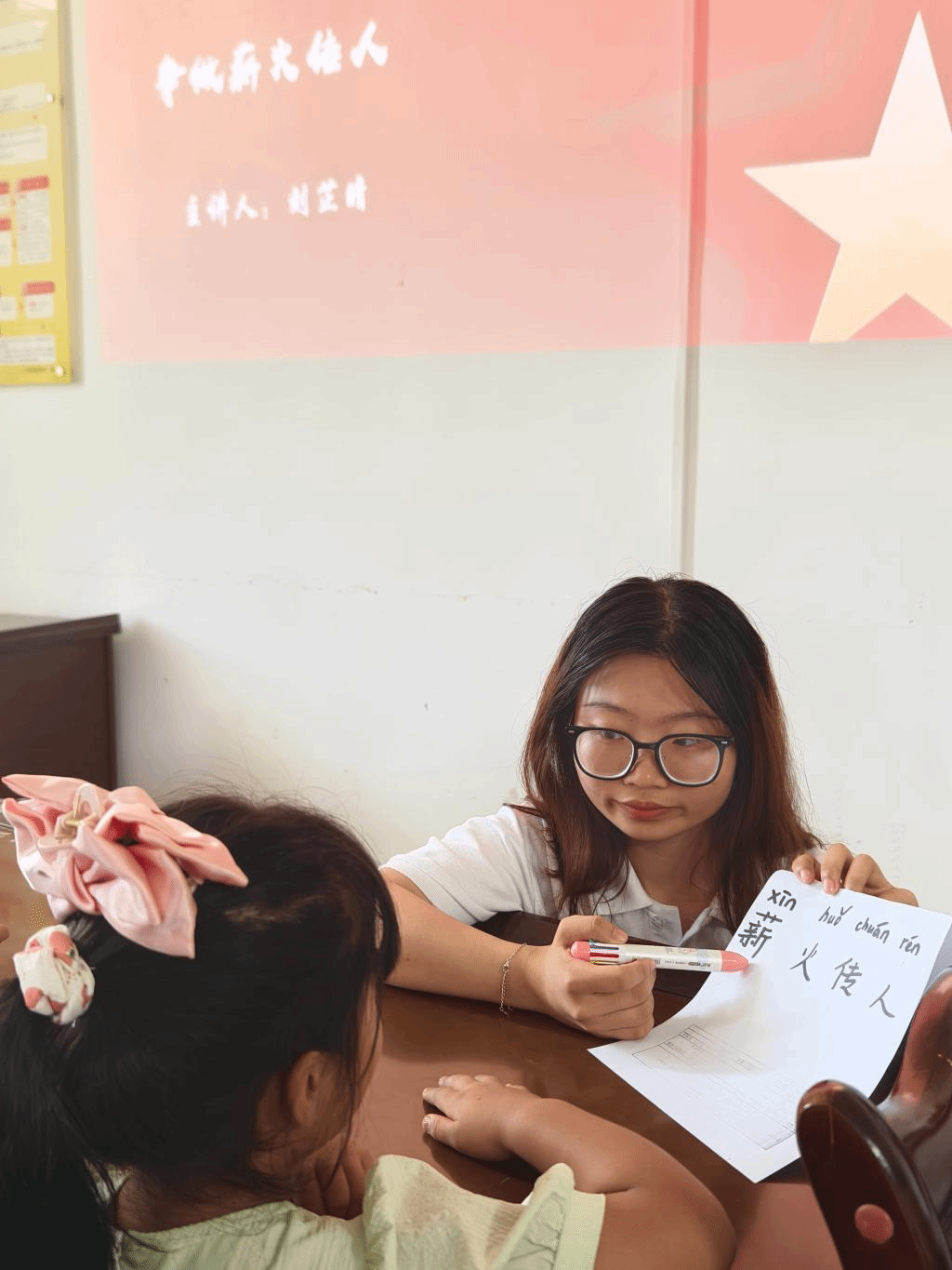 (队员刘芷晴指导学生诵读“薪火传人”)