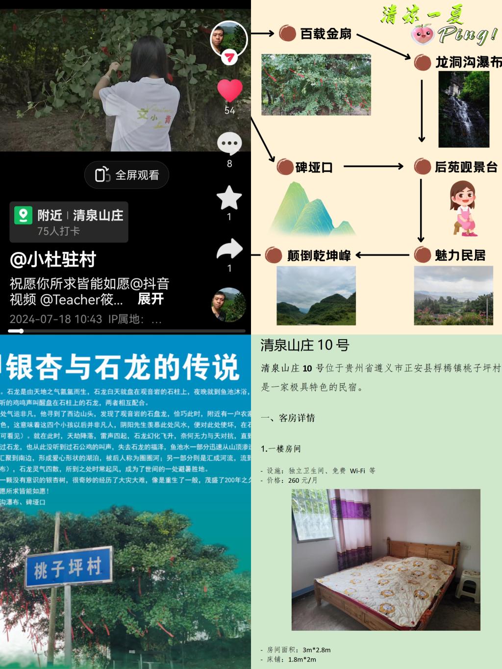 产业振兴,富裕百姓。服务队开展乡村墙绘,完善村规民约。进行文旅视频拍摄,规划文旅路线,采集撰写民间传说并丰富避暑民宿图文资料。开展吉他产业调研,进行吉他广场路演,助力正安县避暑文旅产业、吉他产业繁荣发展。