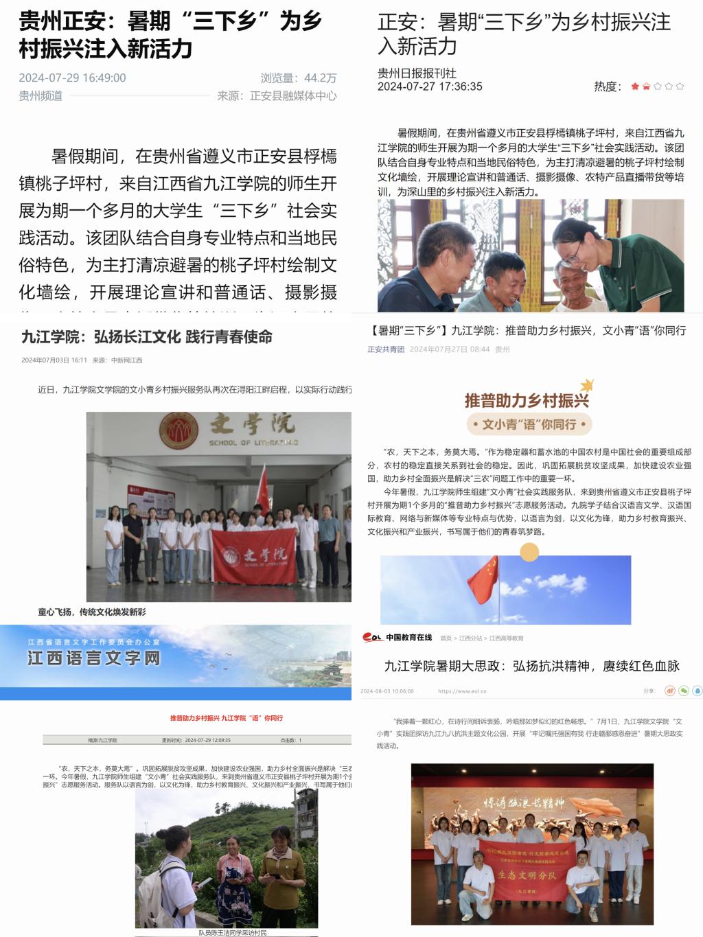 2024年的暑假,九江学院文小青探寻红色印记,寻访文化圣地,于江西省九江市修水县、彭泽县、武宁县和贵州省遵义市正安县开展推普助力乡村振兴志愿服务,将青春书写在广阔的赣黔大地上。