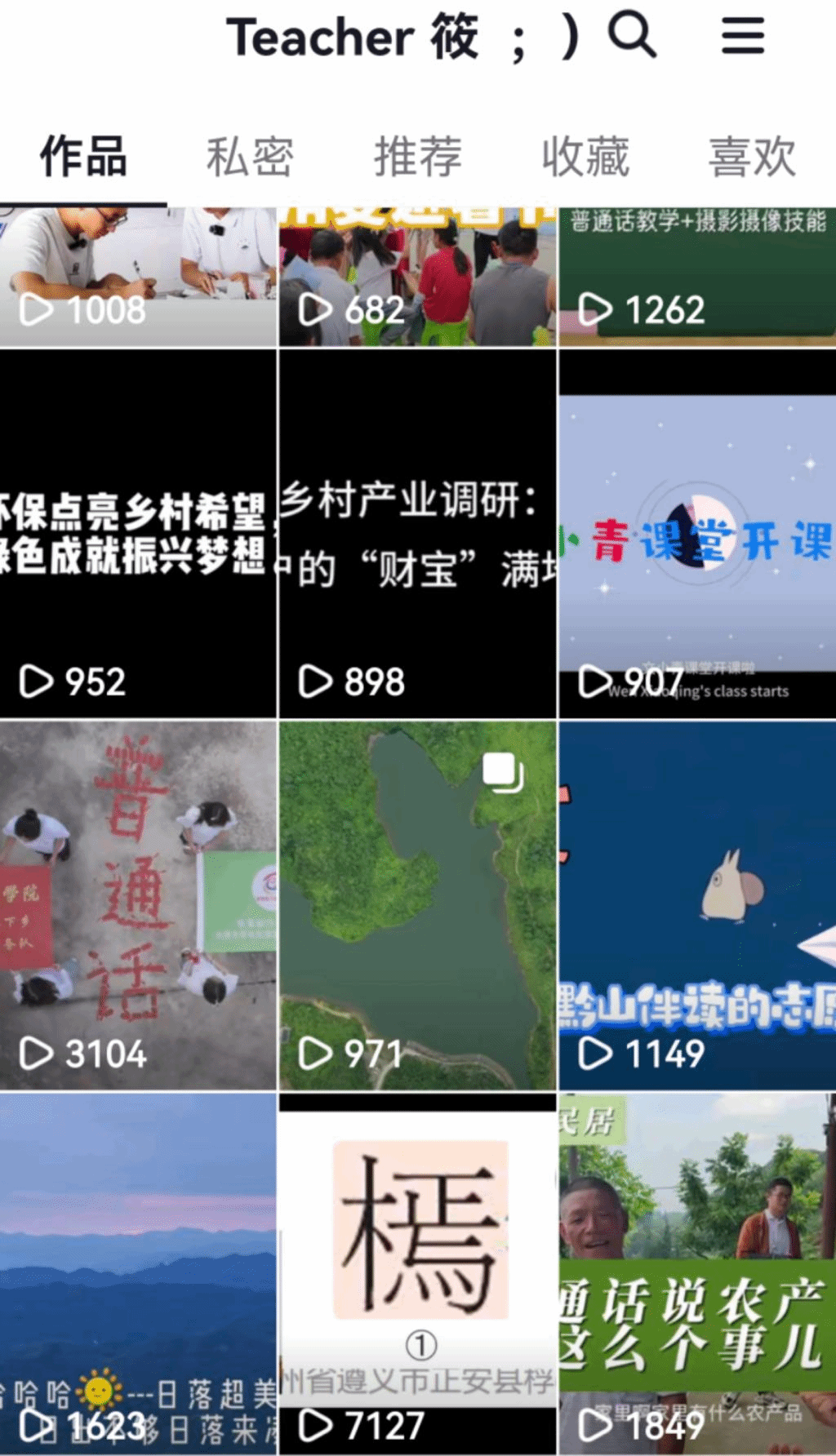 文小青服务队于7月6日开通抖音、B站、今日头条和微信视频号“Teacher筱”,上线视频48条,具体主题有“推普调研”“用普通话说农产品”“说好普通话,祝福千万家”“桃子坪乡村夜校”和“乡村教师访谈”等等,当前全网总浏览量达到13万+。