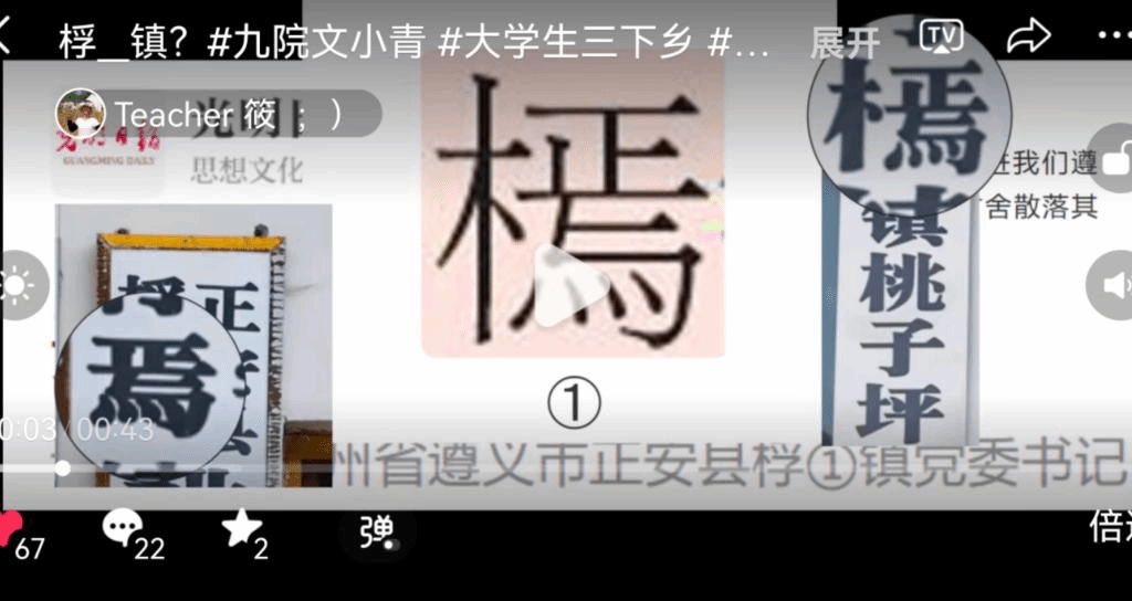 其中推普视频作品“桴镇?”介绍了乡镇名称桴㯊(hén)镇,当地百姓土语音桴㯊(yān)镇的有趣现象,该视频总浏览量近万。