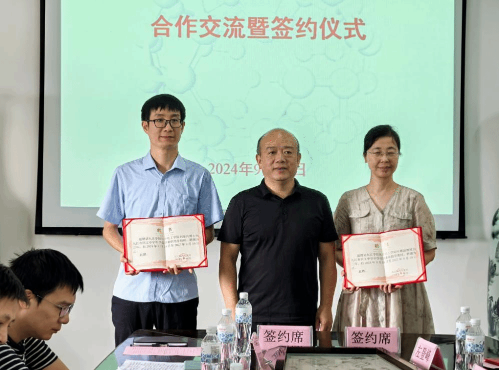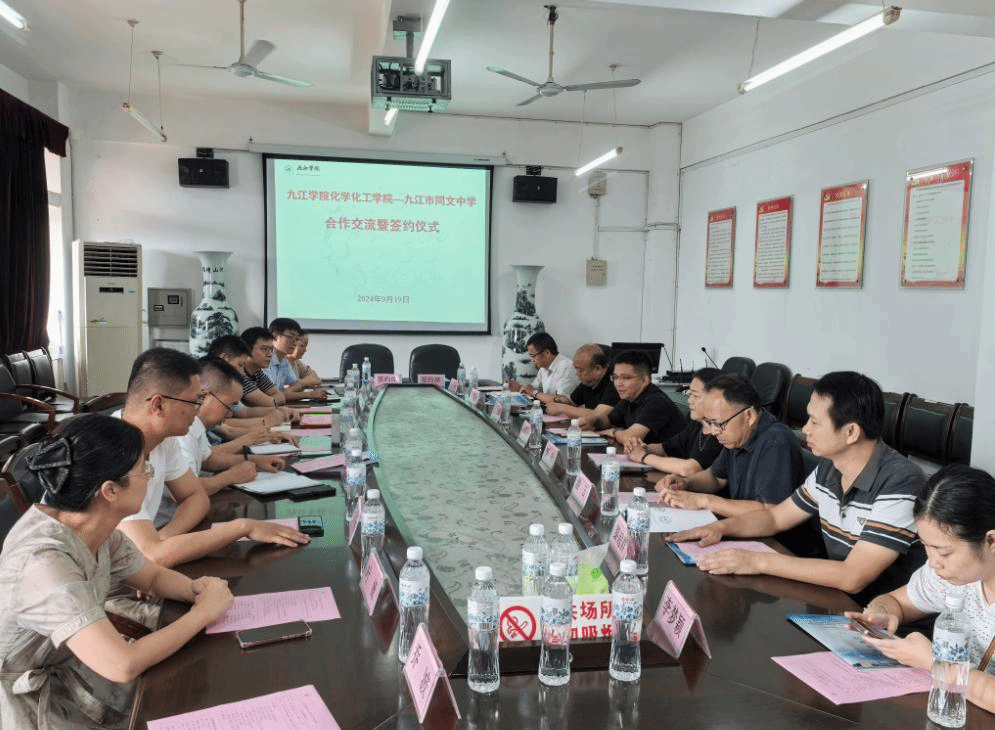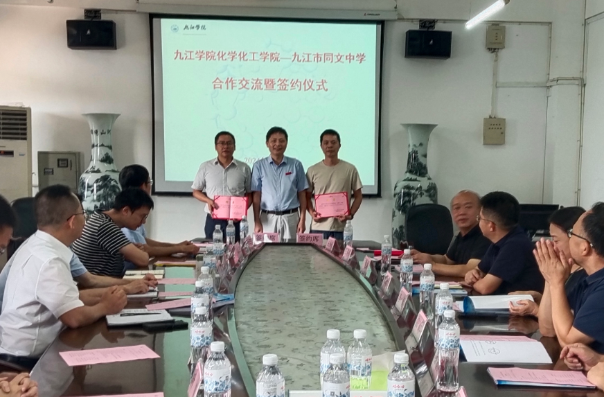 9月19日上午,化学化工学院与九江市同文中学合作洽谈会暨签约仪式在我校丹枫园校区向学楼五楼会议室举行。双方签署了合作协议,举行了人员互聘和交流研讨,并共同为“中学化学开放创新实验室”揭牌。