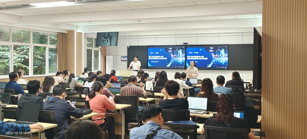 培训中,曹冬铭从为什么建设智慧课程、什么是智慧课程、怎样建设智慧课程以及如何使用智慧课程四个维度进行了深入分析并借助超星教学平台进行展示,清晰地阐述了AI助教与知识图谱对教学的赋能与创新。然后通过现场演示的方式,展示了AI助教的功能介绍、使用技巧等。此外,还分享了知识图谱如何帮助教师构建系统化的教学内容体系,实现知识的精准推送与个性化学习路径规划以及AI助教在促进师生互动、激发学习兴趣等方面的内容。