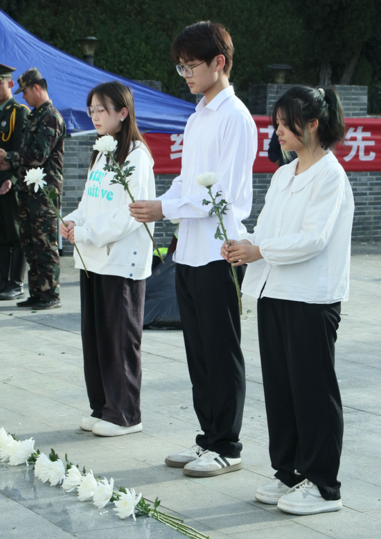 “我们的历史是一部英雄的历史……”朗诵声在陵园上空激荡。同学们齐声诵读散文《英雄》,用字字铿锵的声音与先烈“对话”,铭记峥嵘岁月。广播站成员袁韶宇感慨道:“每一句朗诵都像是在穿越时空诉说,仿佛让我们更加贴近那段烽火硝烟的历史。”默哀仪式后,同学们依次献上白菊,以最朴素而庄重的方式表达无限敬仰与追思。