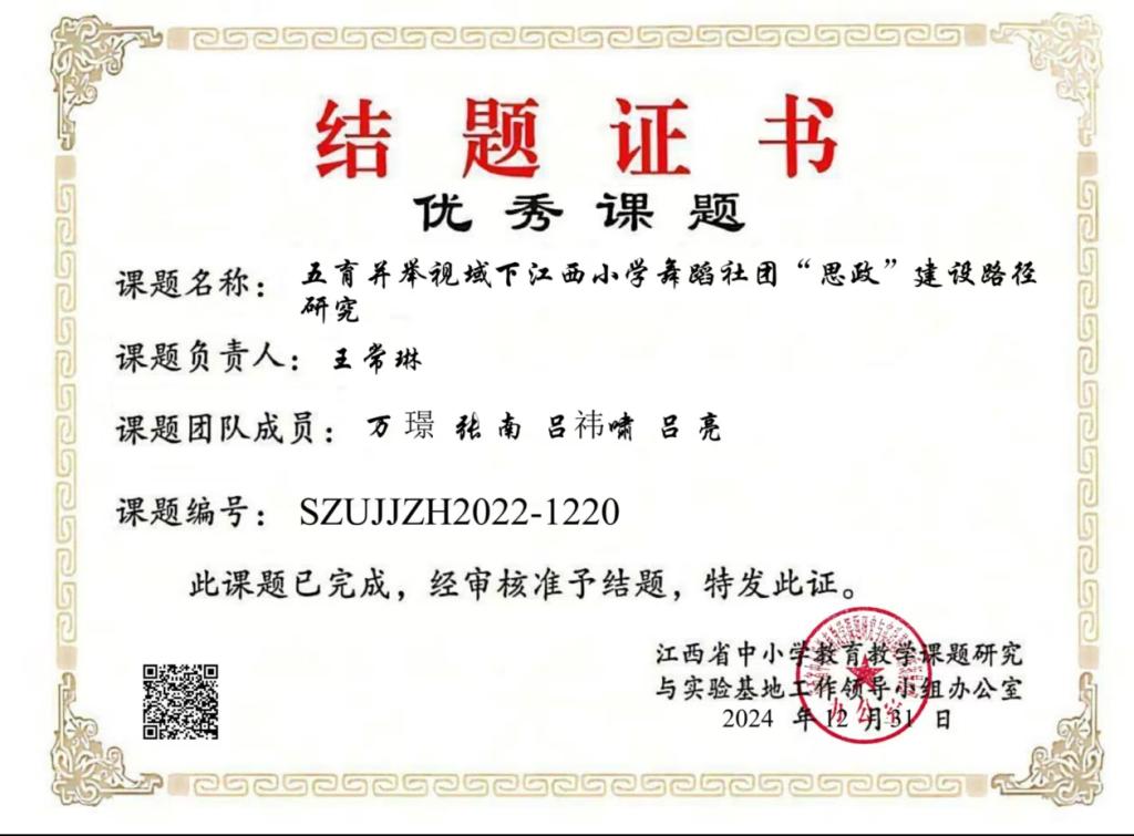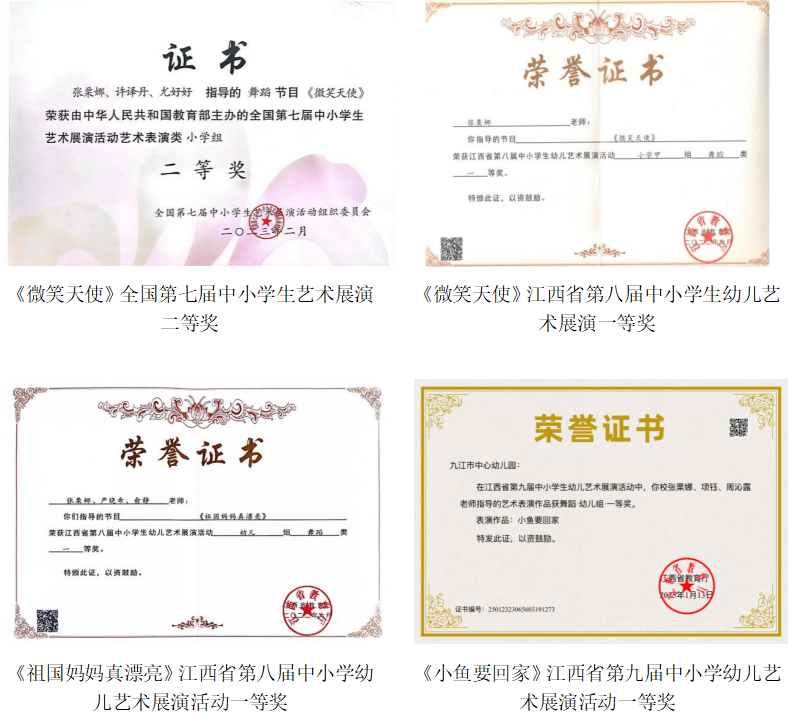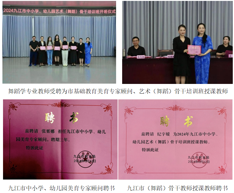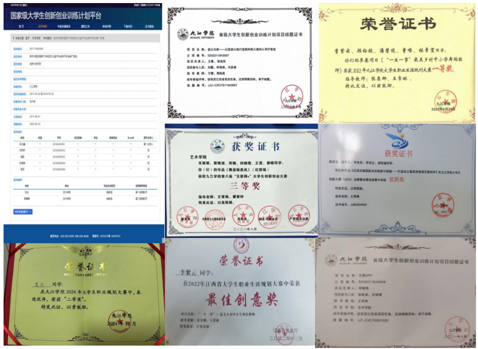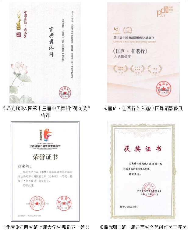 团队教师分别荣获中国舞蹈家协会“优秀志愿者”、中国舞蹈家协会“顶尖教师”、全国素质教育先进工作者、江西省“赣鄱俊才”青年文化领军人才、江西省“文艺人才百千行”优秀志愿者、九江学院“教书育人楷模”“优秀班主任”“优秀教师”等荣誉称号;入选中国舞蹈美育家大辞典、聘为江西省委宣传部“四个100”文化导师、聘为九江市基础教育美育专家顾问;九江市基础教育(舞蹈)授课专家;获批九江市“张栗娜名家工作室”项目资助;入选九江学院“百人计划”等。