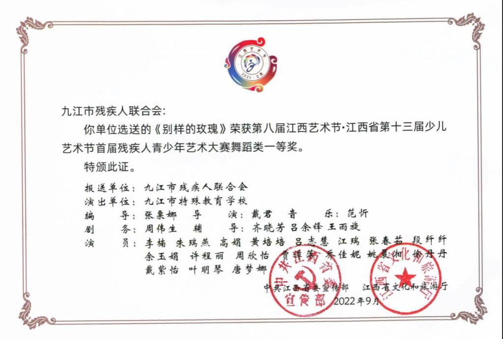 《别样的玫瑰》荣获第八届江西艺术节暨首届残疾人青少年艺术大赛一等奖