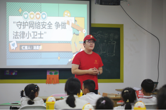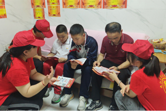 6月23日,服务队深入茶山街道、金湖乡等地开展丰富多彩的普法活动。在茶山街道温馨家园,队员们与街道工作人员携手,走进留守儿童家中,送上精心准备的礼物,并为孩子们科普网络安全知识。为了更好地关爱和帮助这些孩子,队员们还建立了“一对一帮扶”机制,确保每个孩子都能得到持续地关注和帮助。在金湖乡五合村,队员杨逸舟、黄莉为青少年带来了一场精彩的法律宣讲,重点围绕网络诈骗传授防范技巧,增强青少年的自我保护意识。