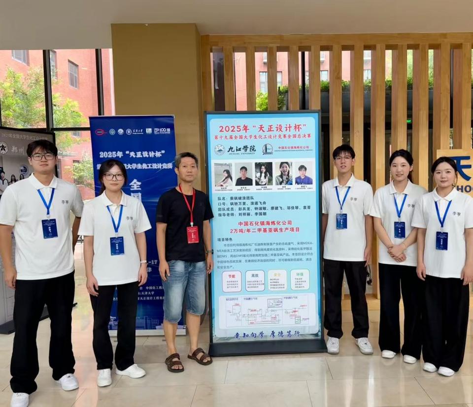 近日,由中国化工学会、中国化工教育协会主办,天津大学承办的2025年“天正设计杯”第十九届全国大学生化工设计竞赛全国总决赛在天津举行,由我校化学化工学院彭兵龙、钟淑敏、廖建飞、邬佳琴、袁菁组成的“乘砜破浪”队设计作品——“中国石化镇海炼化公司2万吨/年二甲基亚砜生产项目”获得全国一等奖。这是我校连续第四年获得这一殊荣。