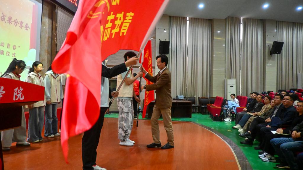 活动现场,吴维勇为“语你同行”“悦动青春”两支校级专项青年志愿者服务队授旗。